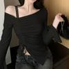 Síťovaný Patchwork Dámské Tričko s Dlouhým Rukávem Crop Nařasené Odhalené Rameno BodycDF-1299-Černé-Son Sexy Elegantní Streetwear 2024 Jaro Léto