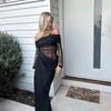 Y2k letní jednobarevné šaty s dlouhým rukávem bez ramene Sexy zavinovací boky Síťované dlouhé šaty s prošívaným vzorem