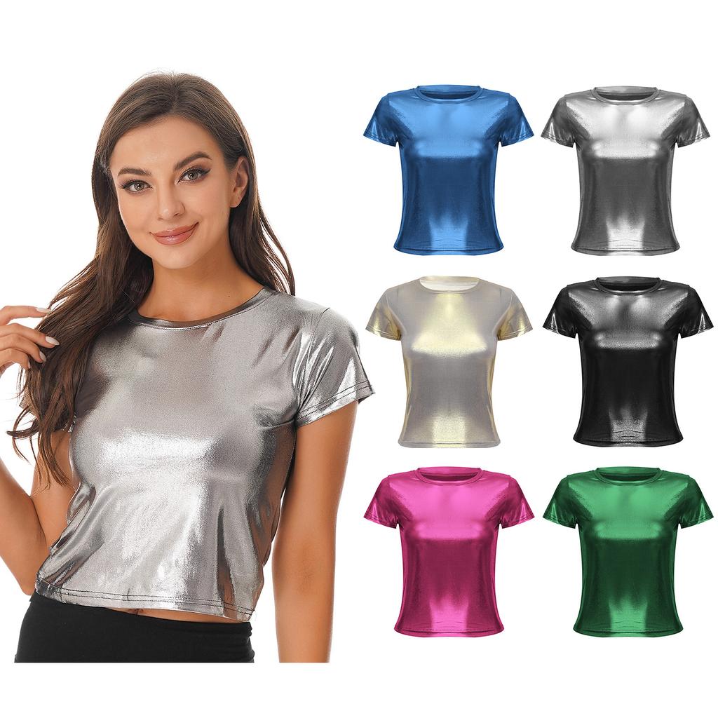 Dámské metalické párty tričko s lesklým krátkým rukávem, kulatým výstřihem a reflexním topem pro taneční večírky a festivaly