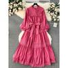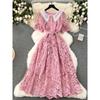 French style Retro Palace Style Lantern Sleeve Lace-up Waist Hugging Single-Breasted Dress Women Slimming Temperament Elegant Long Skirt
