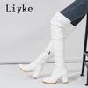 Fashion Liyke 2025 Autumn Winter Pleated Patent Leather Knee High Boots Female Pointed Toe Slip On Motorcycle Shoes Women Square Heels
