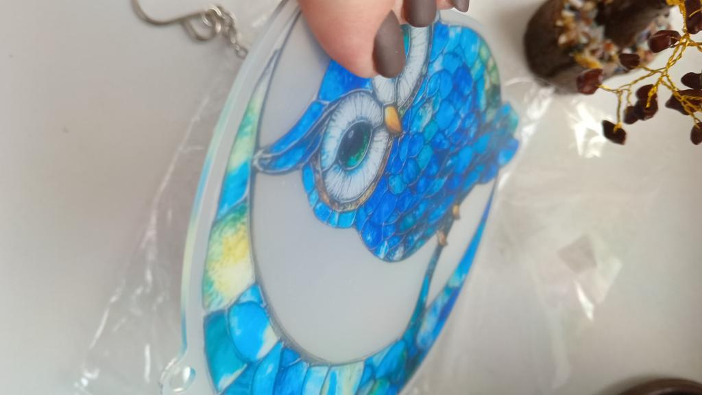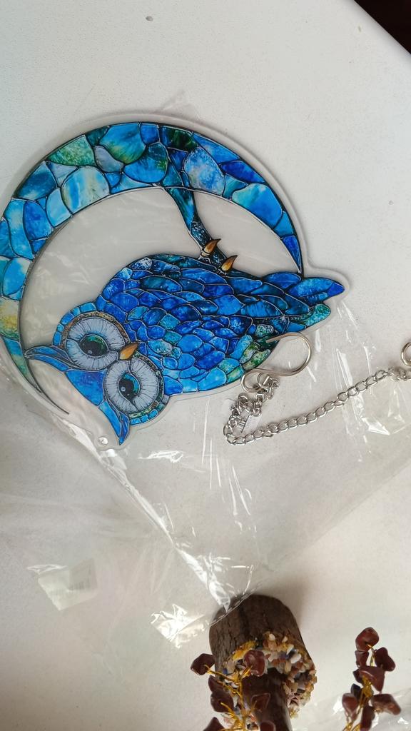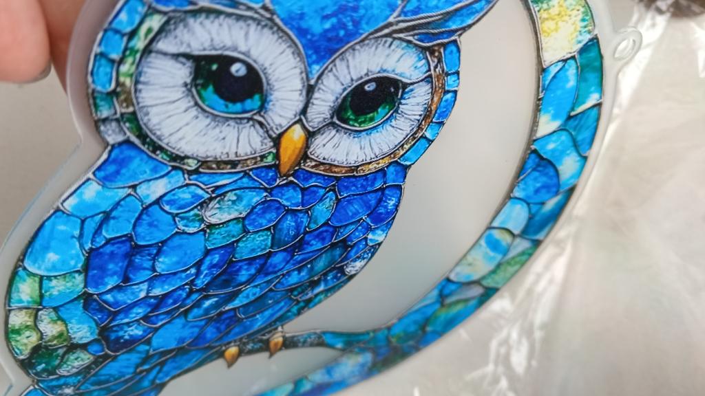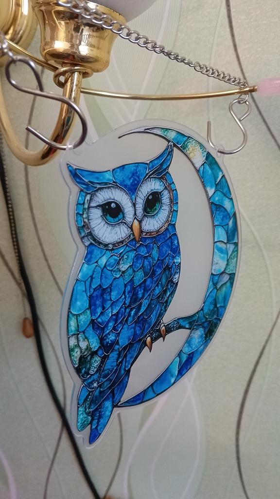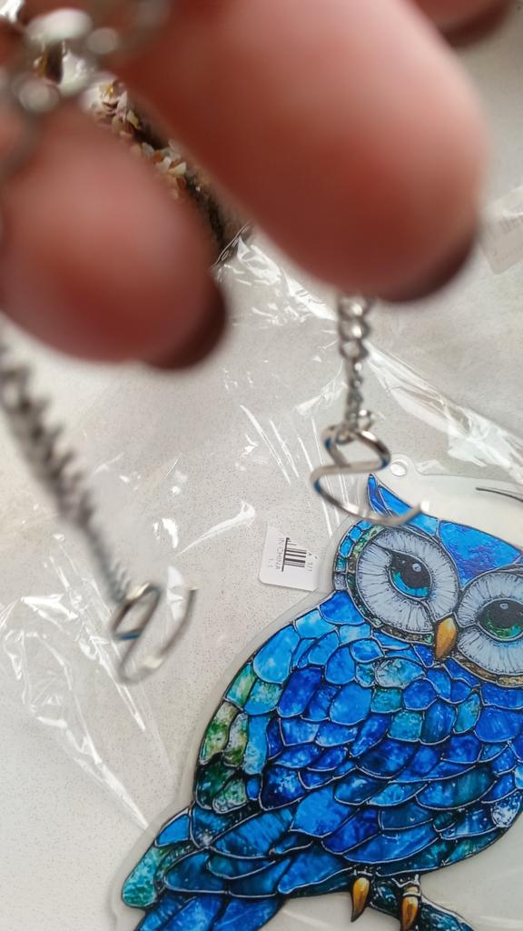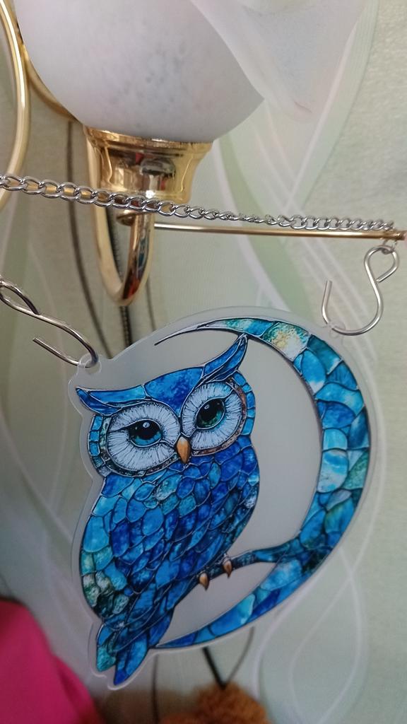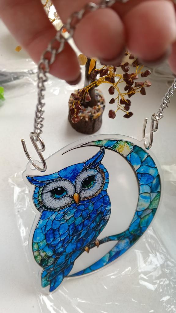 Featuring a charming double owl design in blue and white, these owls stand side by side with vivid expressions and intricate feather textures. Easily hang this sun catcher with the included solid metal chain on any sunlit window or wall. Elevate your home's style with this pendant that complements various spaces and sizes effortlessly.