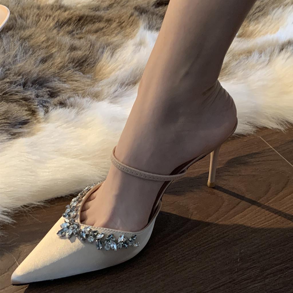 2025 Summer New Pointed Rhinestone High Heel Fine Heel Champagne One Word with Sandals Half Drag Cool Slippers Outer Wear Women