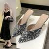 CRLAYDK 2024 Summer Women's Heeled Sequin Sandals Closed Pointed Toe Dressy Slip On Party Wedding Shoes Comfortable Mules