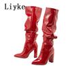 Fashion Liyke 2025 Autumn Winter Pleated Patent Leather Knee High Boots Female Pointed Toe Slip On Motorcycle Shoes Women Square Heels