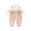T-shirt: 100% cotton, Overalls: lining 100% cotton, front: 42% cotton, 55% polyester, 3% spandex.