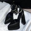 Luxury Crystal Design Chunky Platform Sandals Women Sexy Round Toe Super High Heeled Fashion Satin Ankle Strap Prom Pumps Female