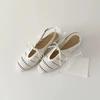 French hollow woven one-word button square head Roman sandals women's 2025 new bow thick heel holiday sandals