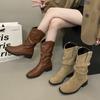 Inner height increase Small retro thick heel short boots Women's 2025 popular new versatile and thin pleated western cowboy boots