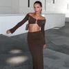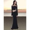 Women's Autumn Fashion Personality Oblique Shoulder Metal Decoration Flared Sleeve Top High Waist Skirt Set