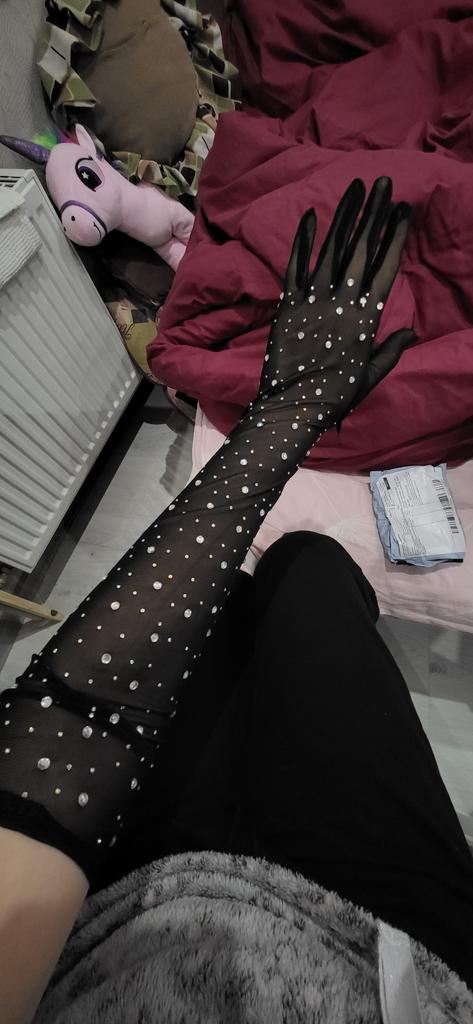 Подчеркните свой стиль с помощью этих элегантных длинных черных перчаток, выполненных в стиле варежки и украшенных сверкающими стразами, которые красиво отражают свет.