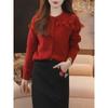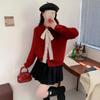 Women's Christmas Red Lace Bow Sweater - Korean Style, Round Neck, Love Gold Button, Age-Defying Knit Cardigan D1067